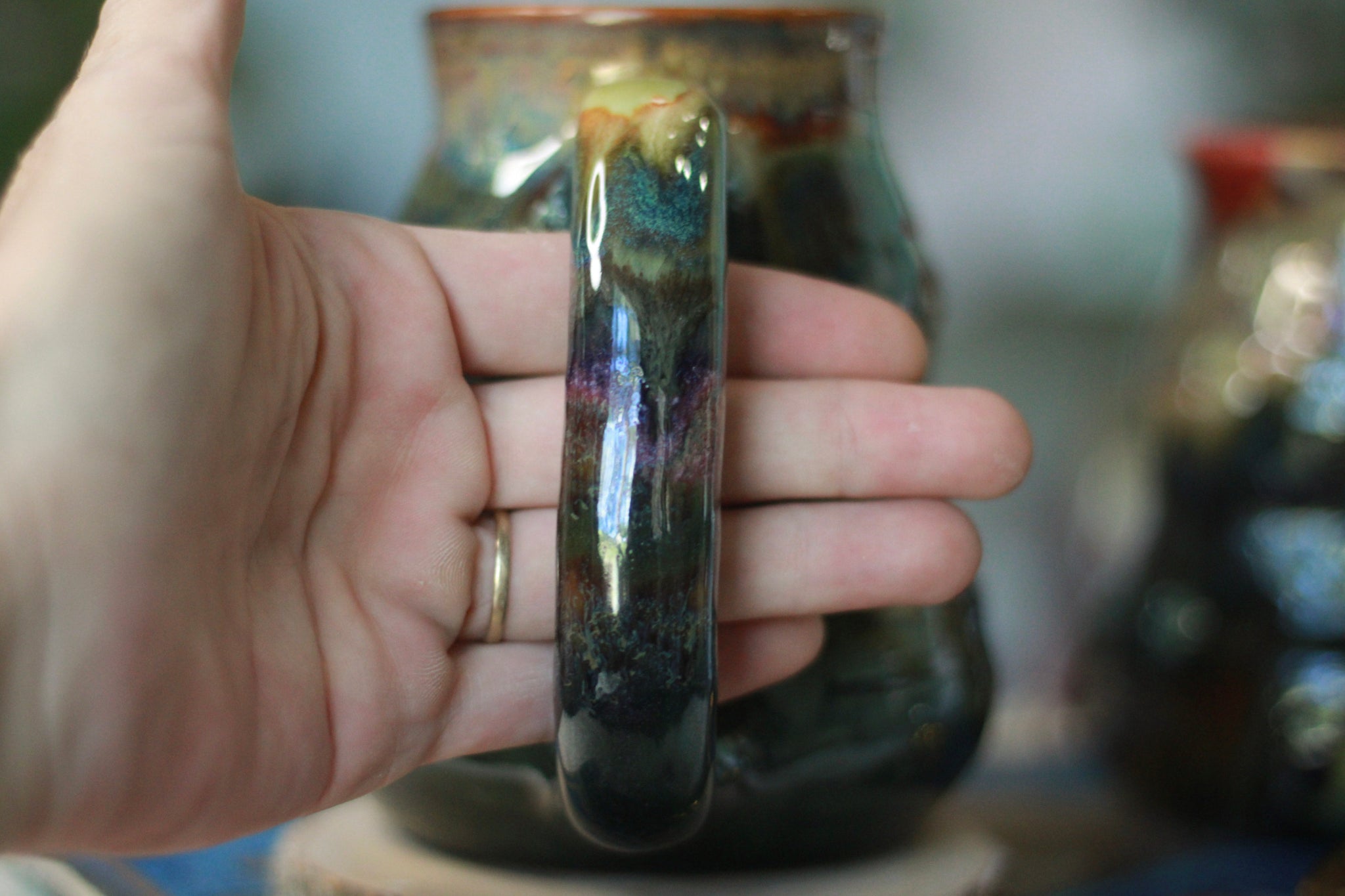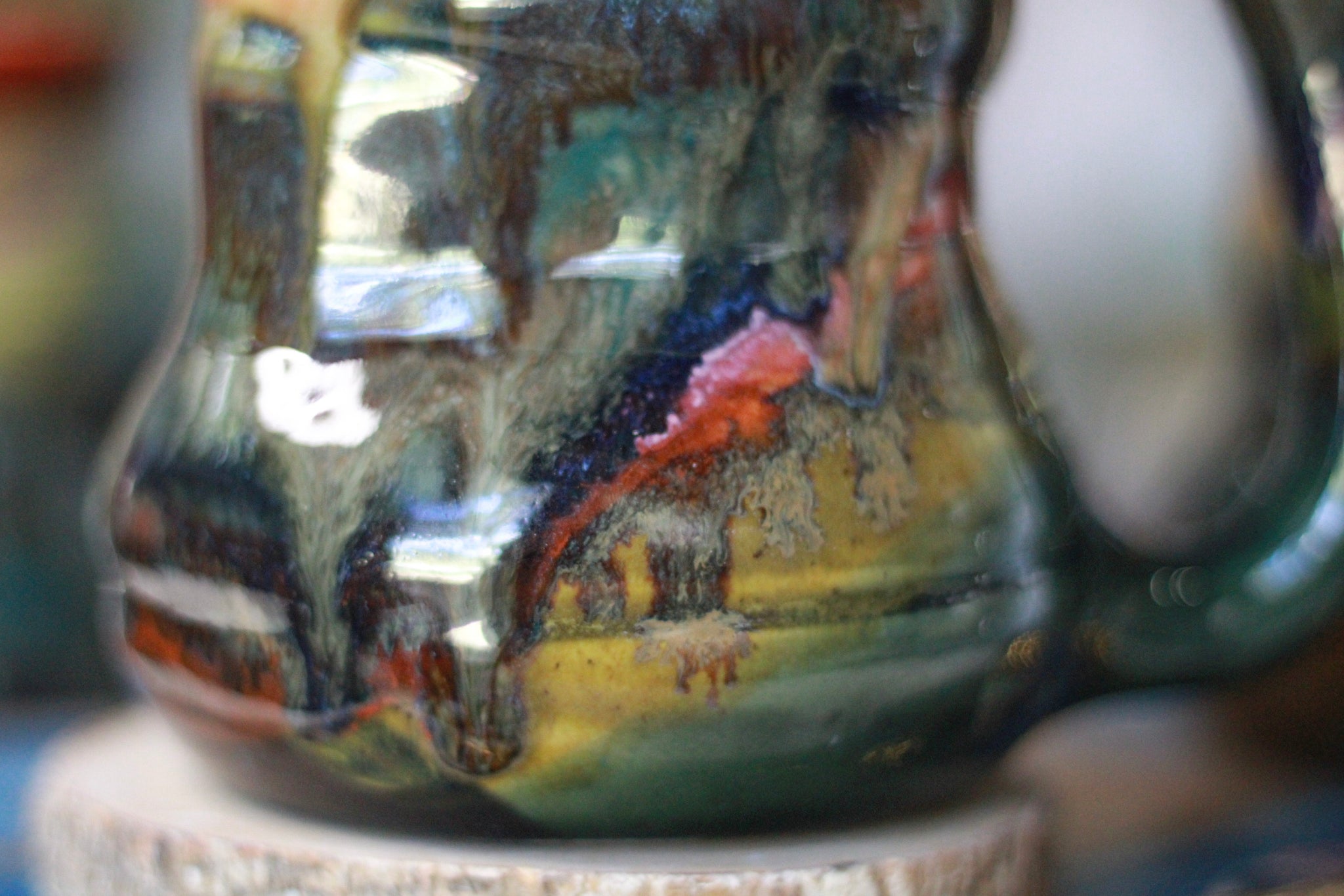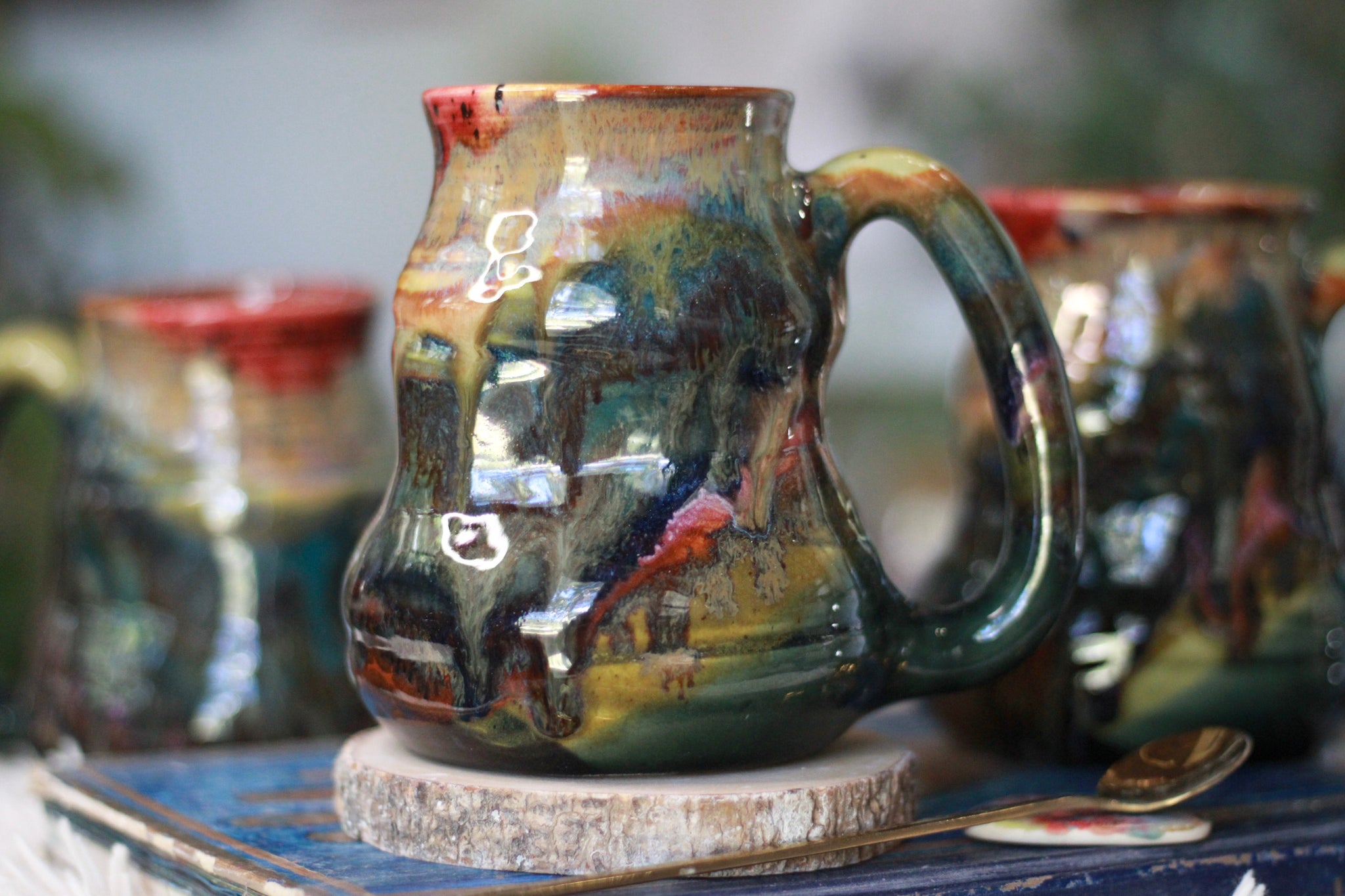 THE FEEL: These are such colorfully playful and cozy mugs! The colors remind me of my favorite palette of the 90’s with earthy tones and jewel tones mixing up in messy and playful ways. It fits the feel of the mugs with their gentle divots & grooves, comfortably huggable 4 finger handles and curvy cuppable bases that feel soothing on the hands