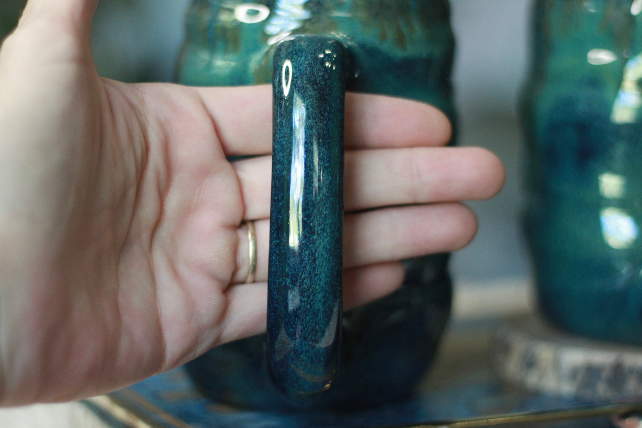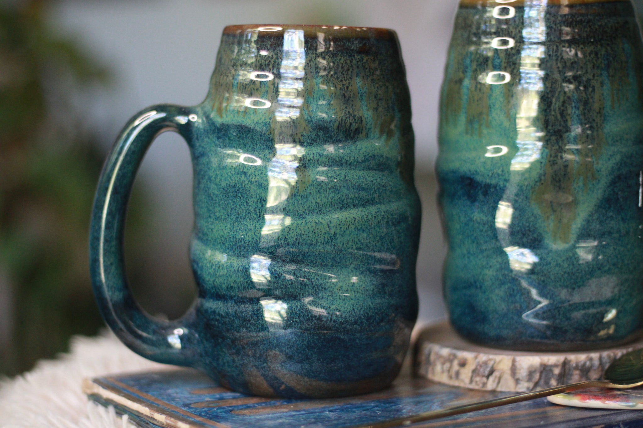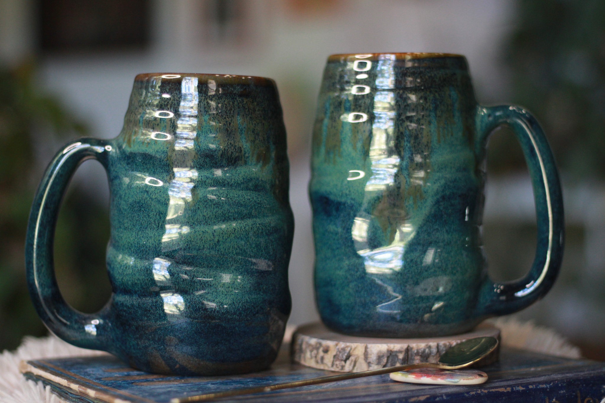 THE FEEL:  These textured divot stein mugs have a lot going on with their comforting heft, comfortable 4 finger handle, deep, engaging grooves & grippable divots and a smooth, cuppable base.