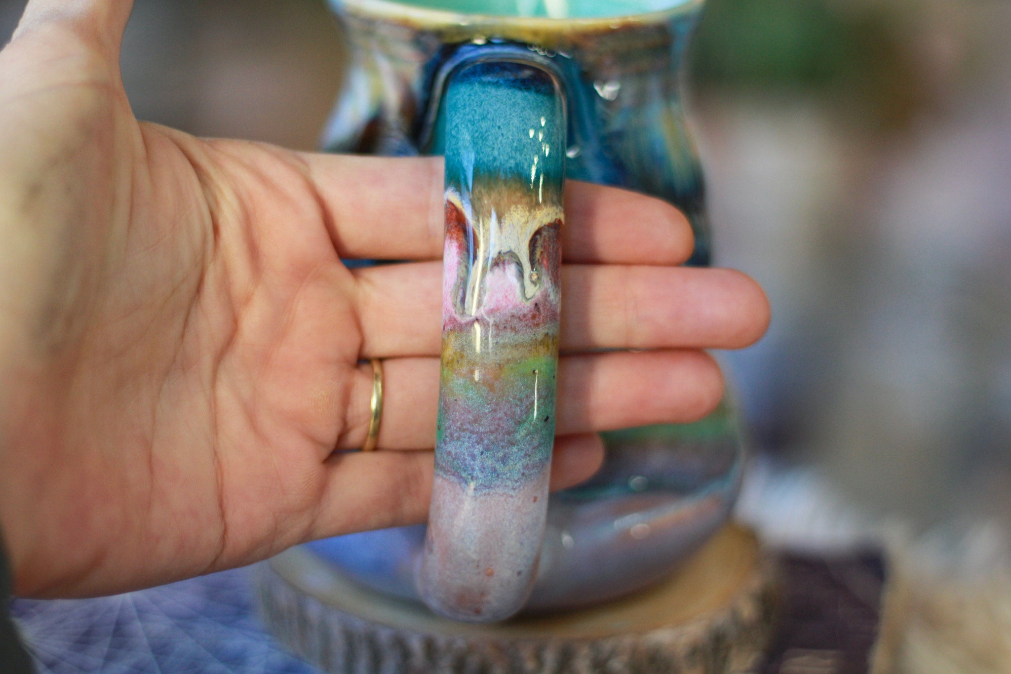 These softly glazed Cuddle mugs are giving soothing vibes with their comfortable heft, engaging divots and grooves that entice a cozy fit, a 4 finger handle with a comfortable grip, soothing divots, subtle grooves and a smooth cuppable base. VERY cozy mugs.