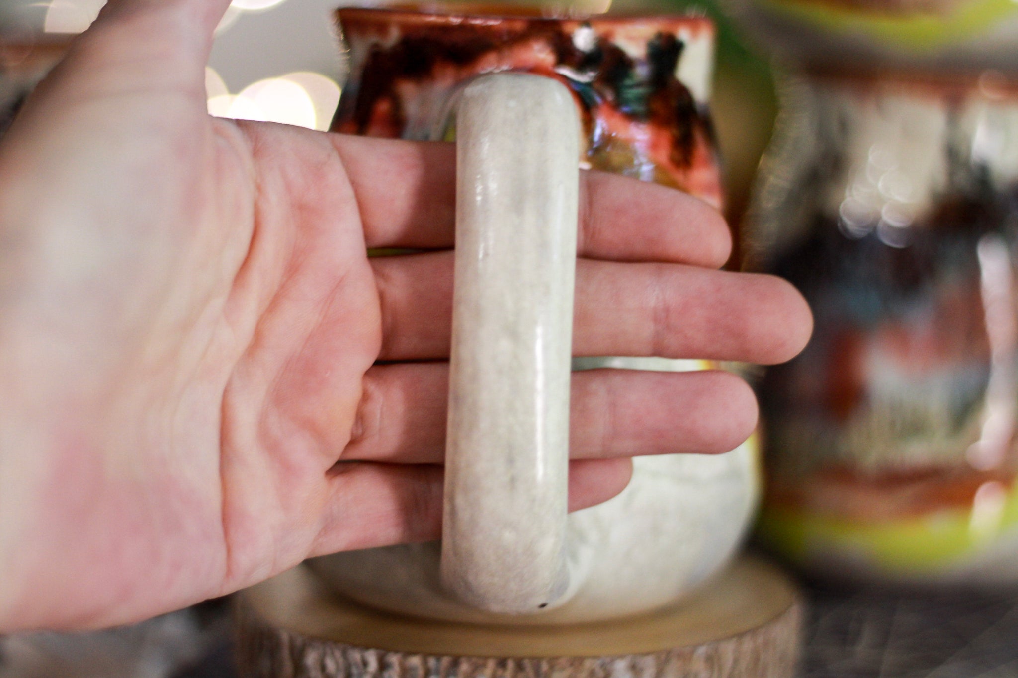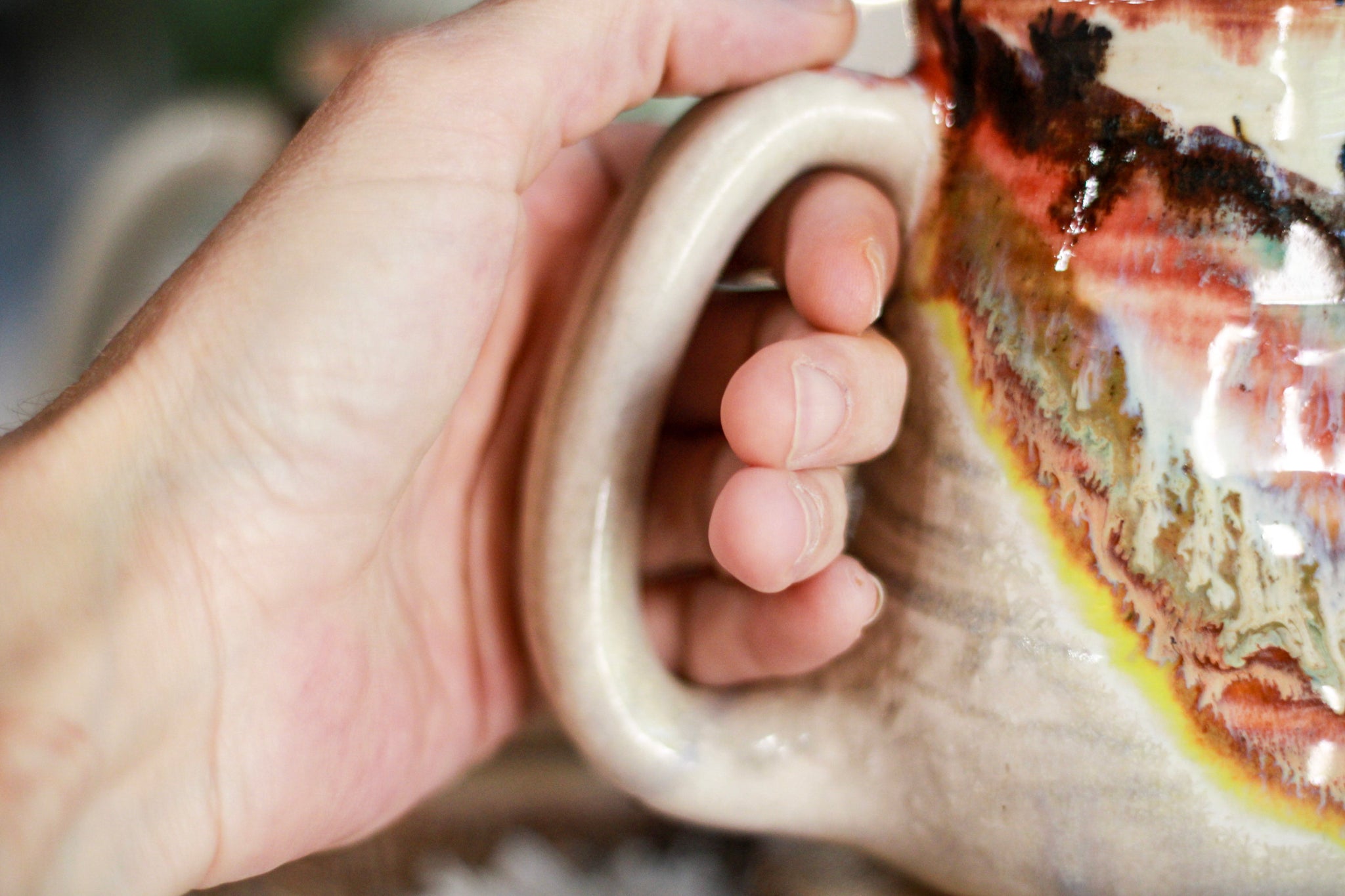 THE FEEL: These curvy mugs with their balanced weight and cozy 4 finger handle have subtle grooves, gentle divots and a smooth cuppable base that invite your hands to find a comforting grip.