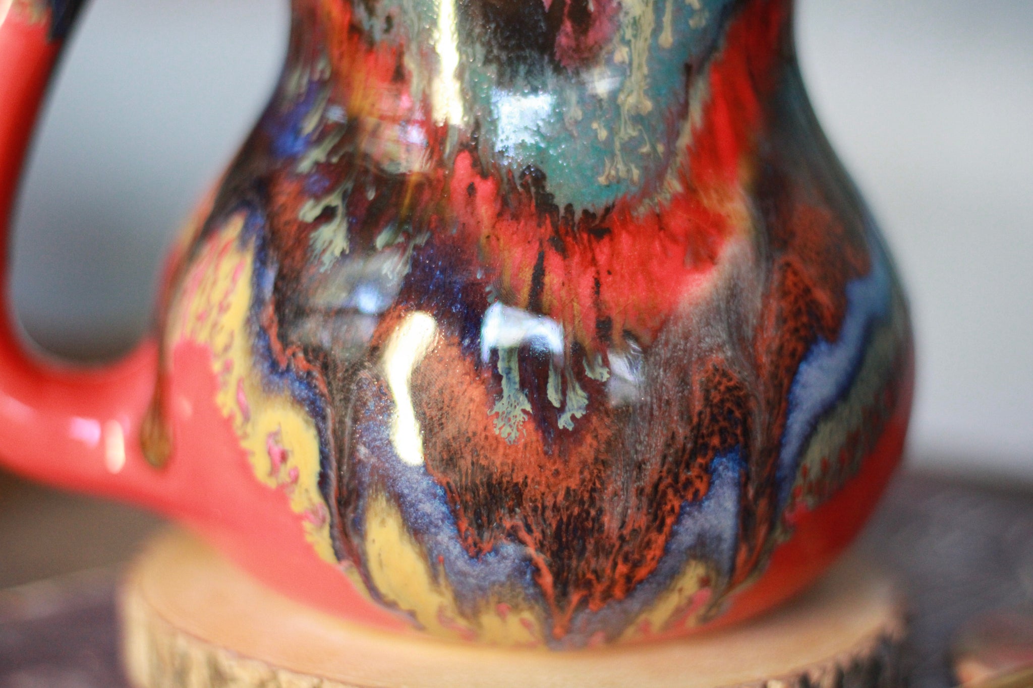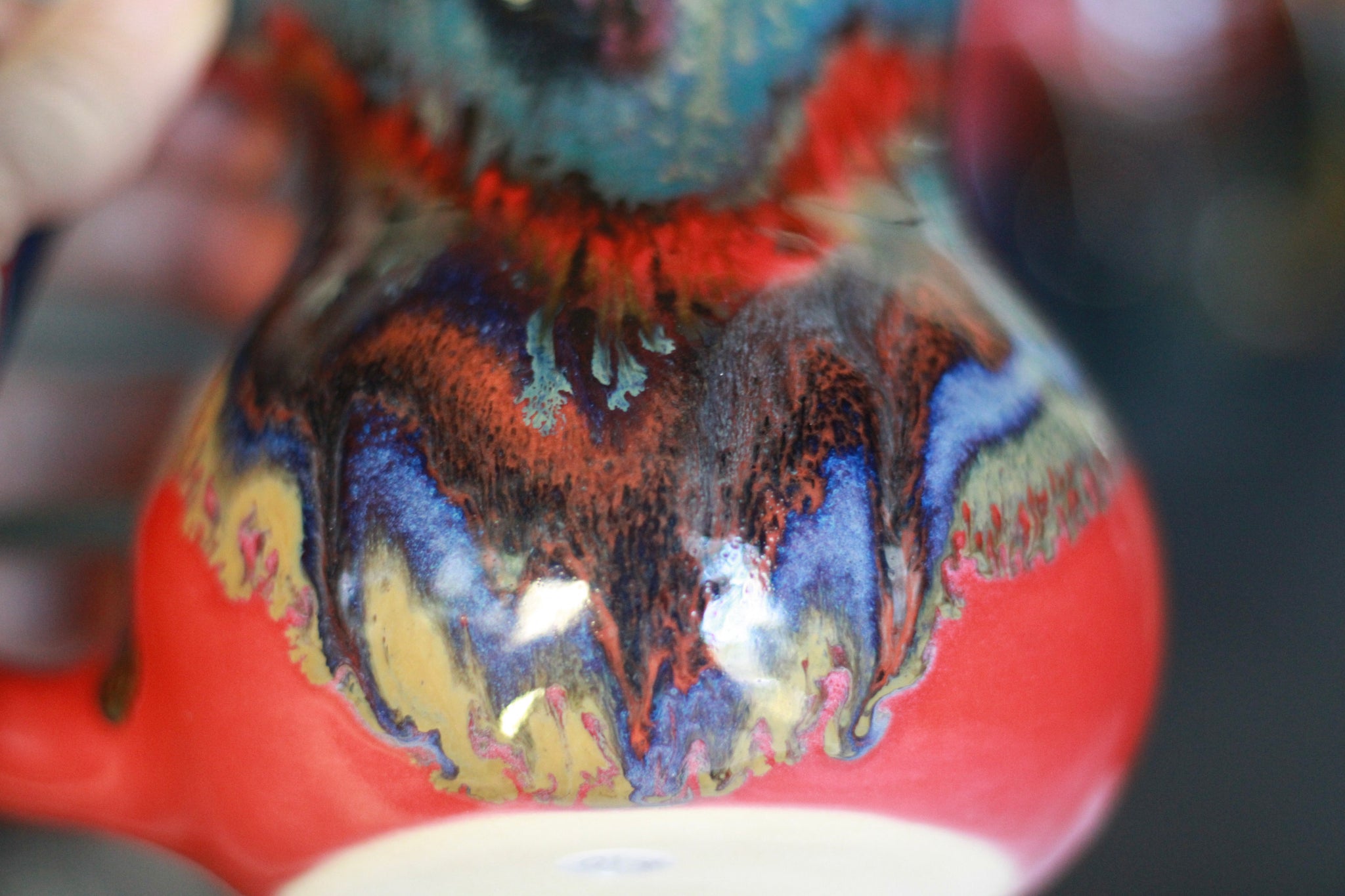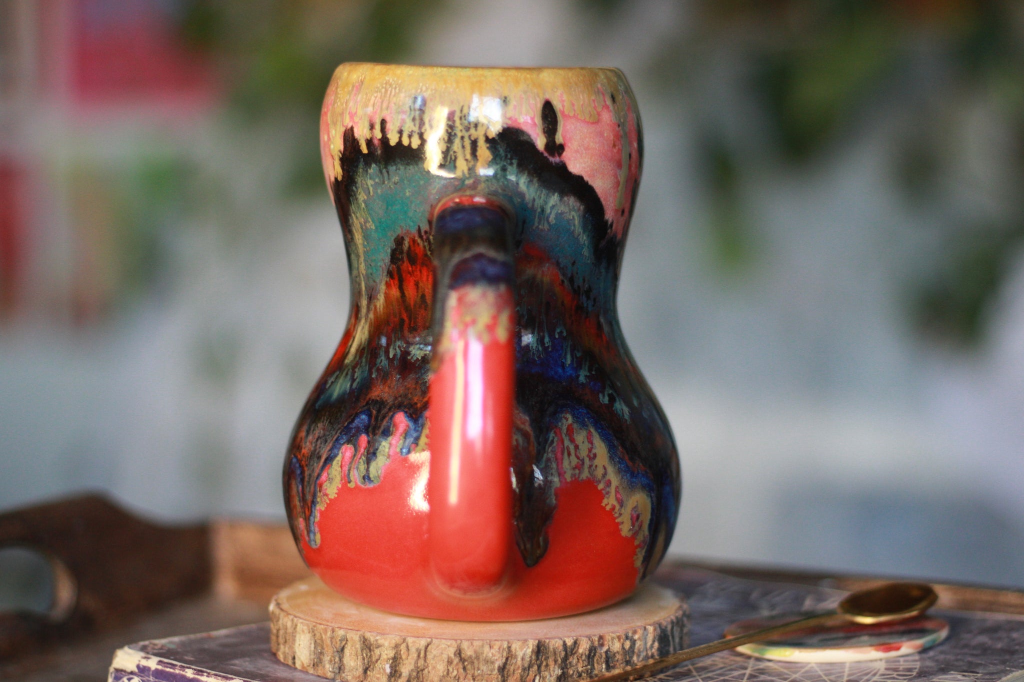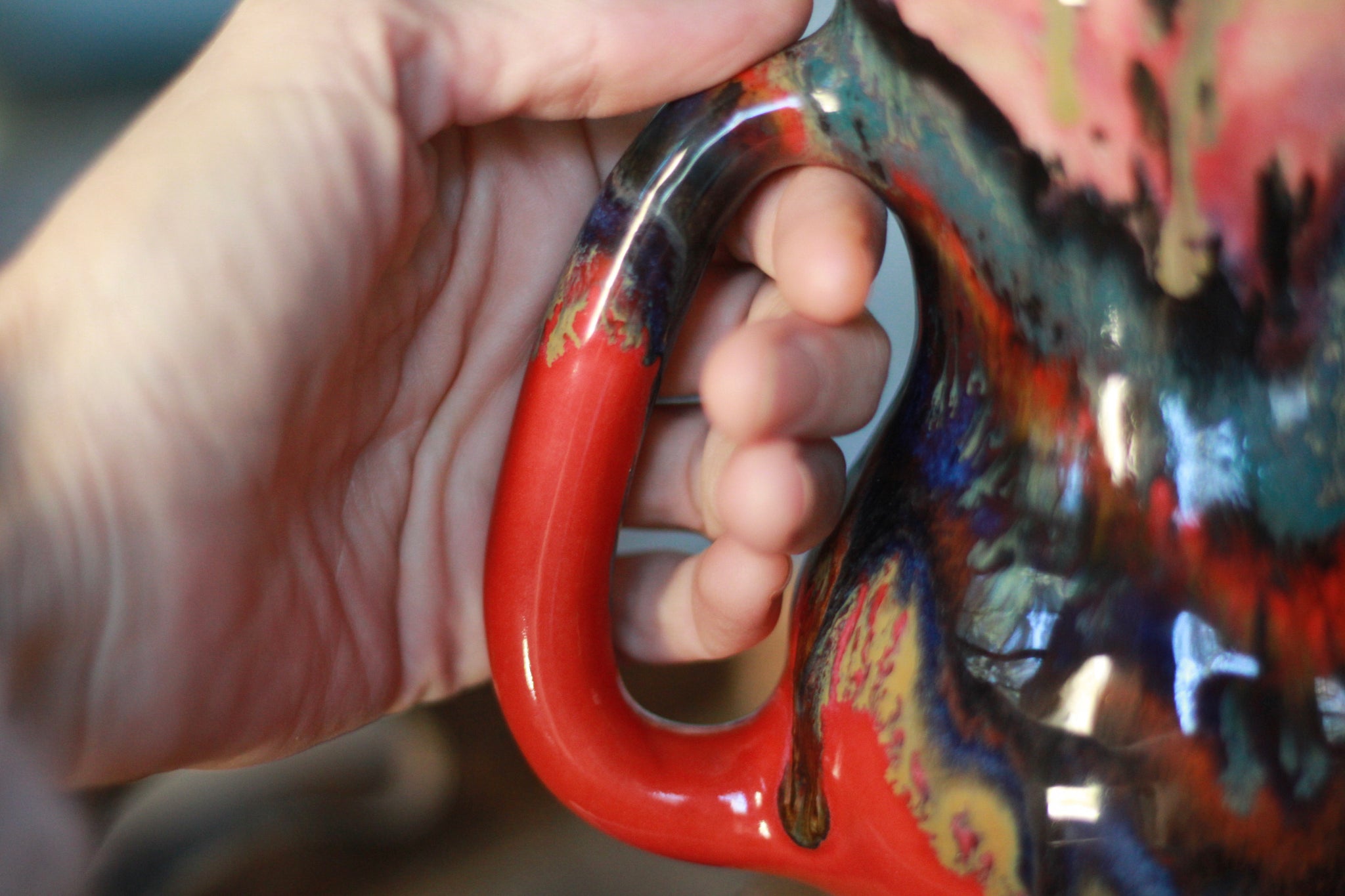 THE FEEL: This large curvy gourd mug is a soothing delight to hold with its balanced heft, very comfortable four finger handle and wide, smooth, cuppable base.