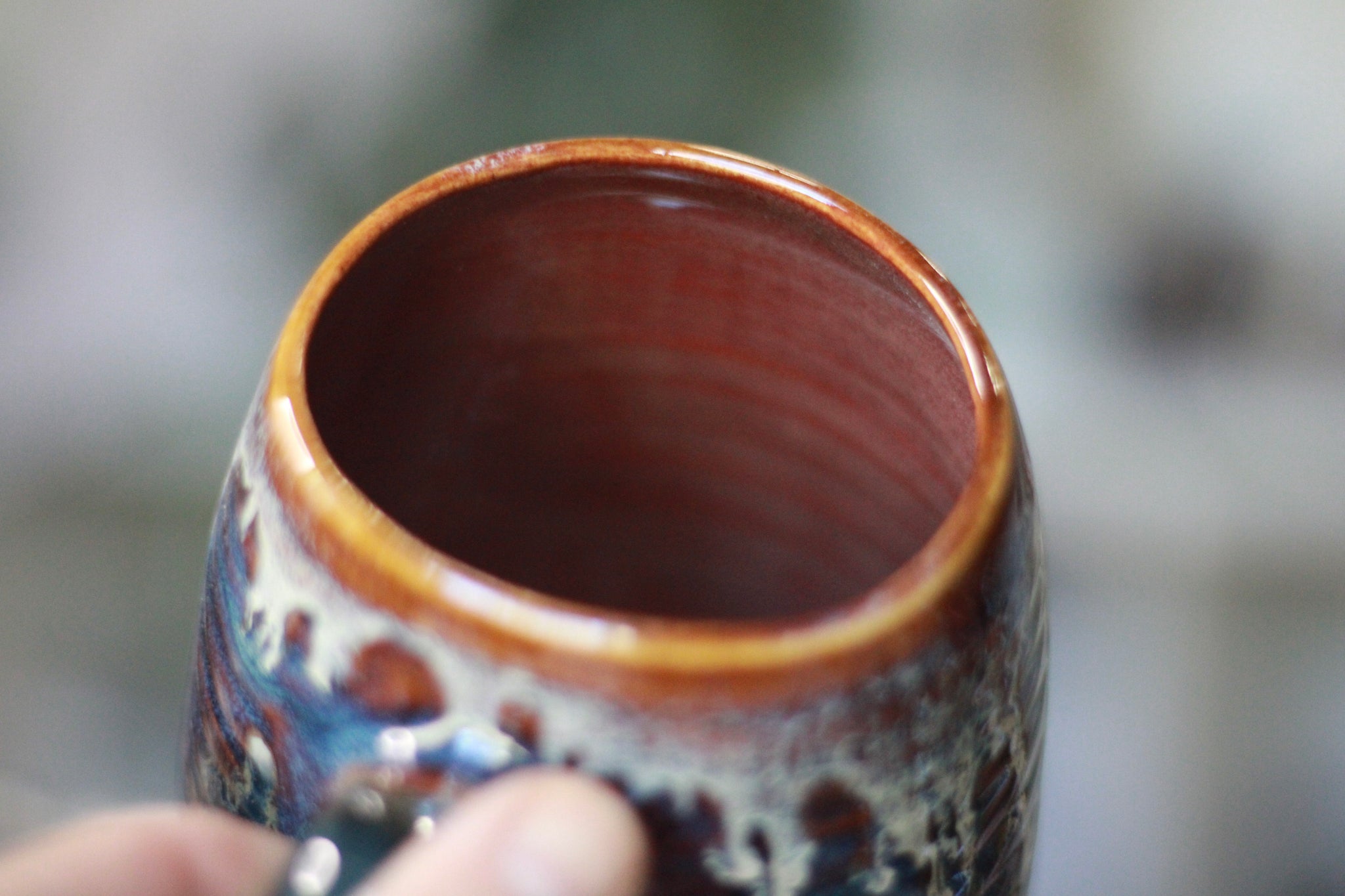 THE FEEL:  I discovered that this combo likes to be a smidge cooler.  It came out a little less defined than normal but some of my collectors enjoy the ‘hotter flow’.  The mugs feel simple, calm and cozy with a grounding heft, a comfortably huggable four finger handle, subtle soothing grooves and a smooth, gently curved base. Sensory Details: There is a bit of an orange peel texture where glaze pooled a bit thicker near the base.