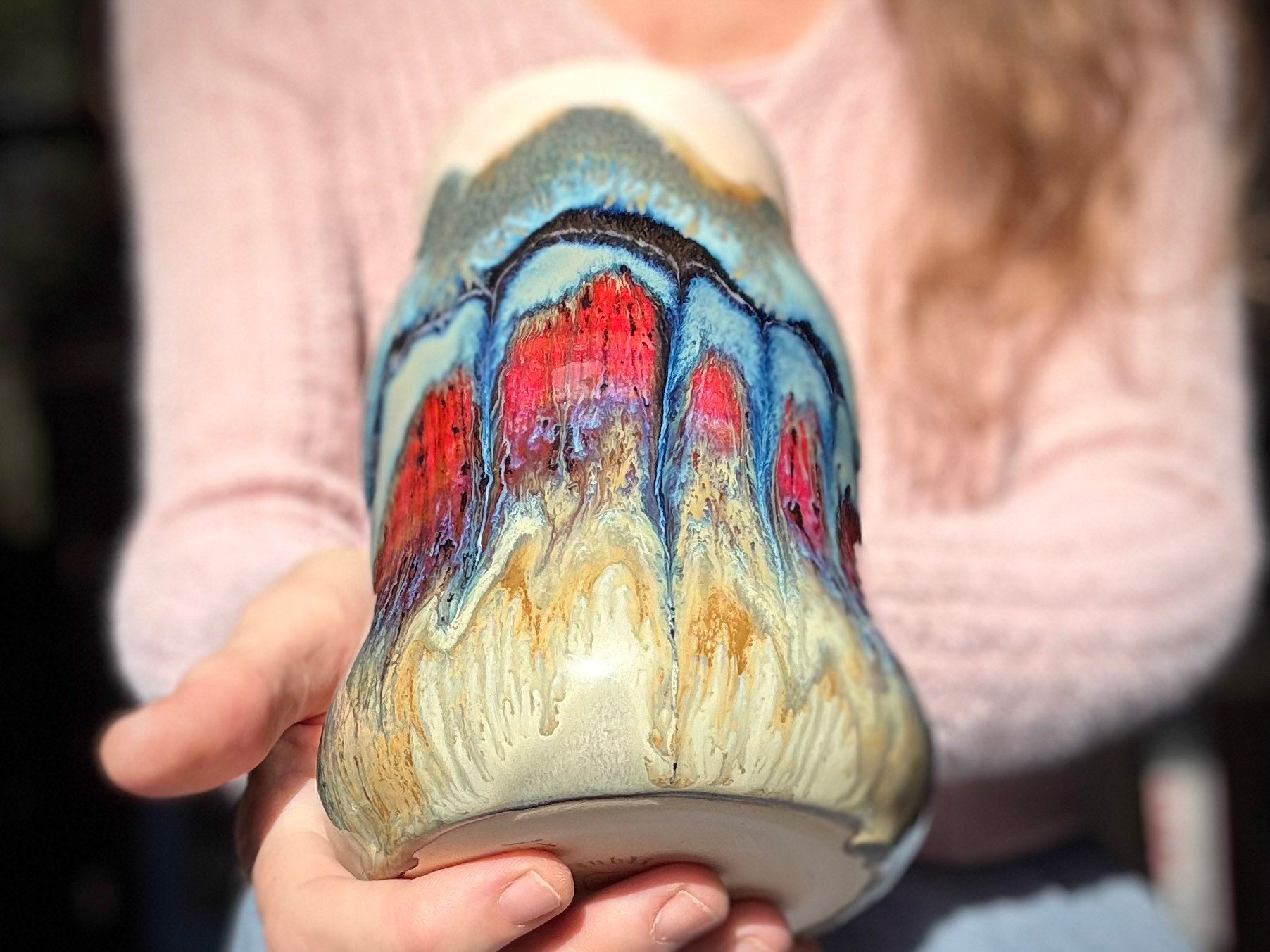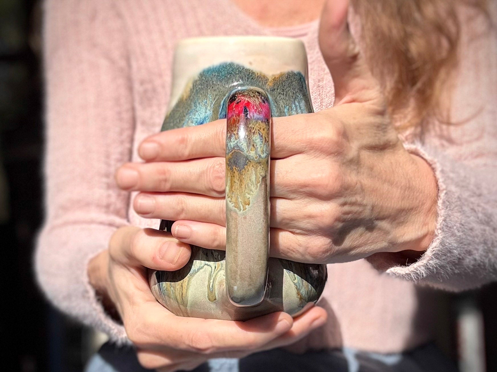 THE FEEL: This curvy mug has a deliciously grounding but not too hefty weight, a beautifully balanced 4 finger handle and a wide,curvy, cuppable base. Sensory details: a number of small pits and glaze drips that are at the base may interrupt the sensory flow just a bit.