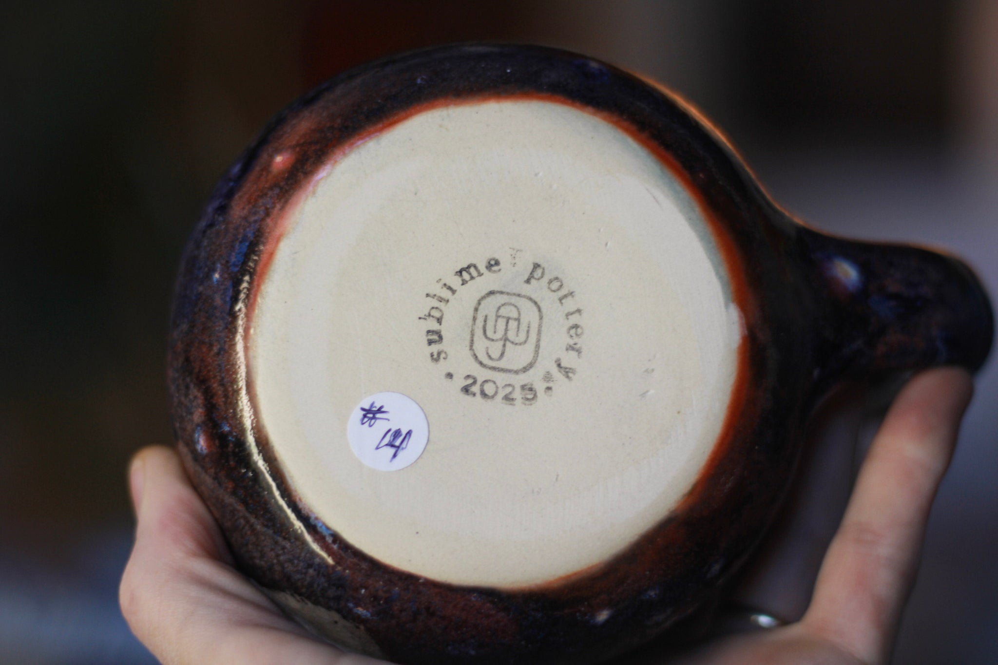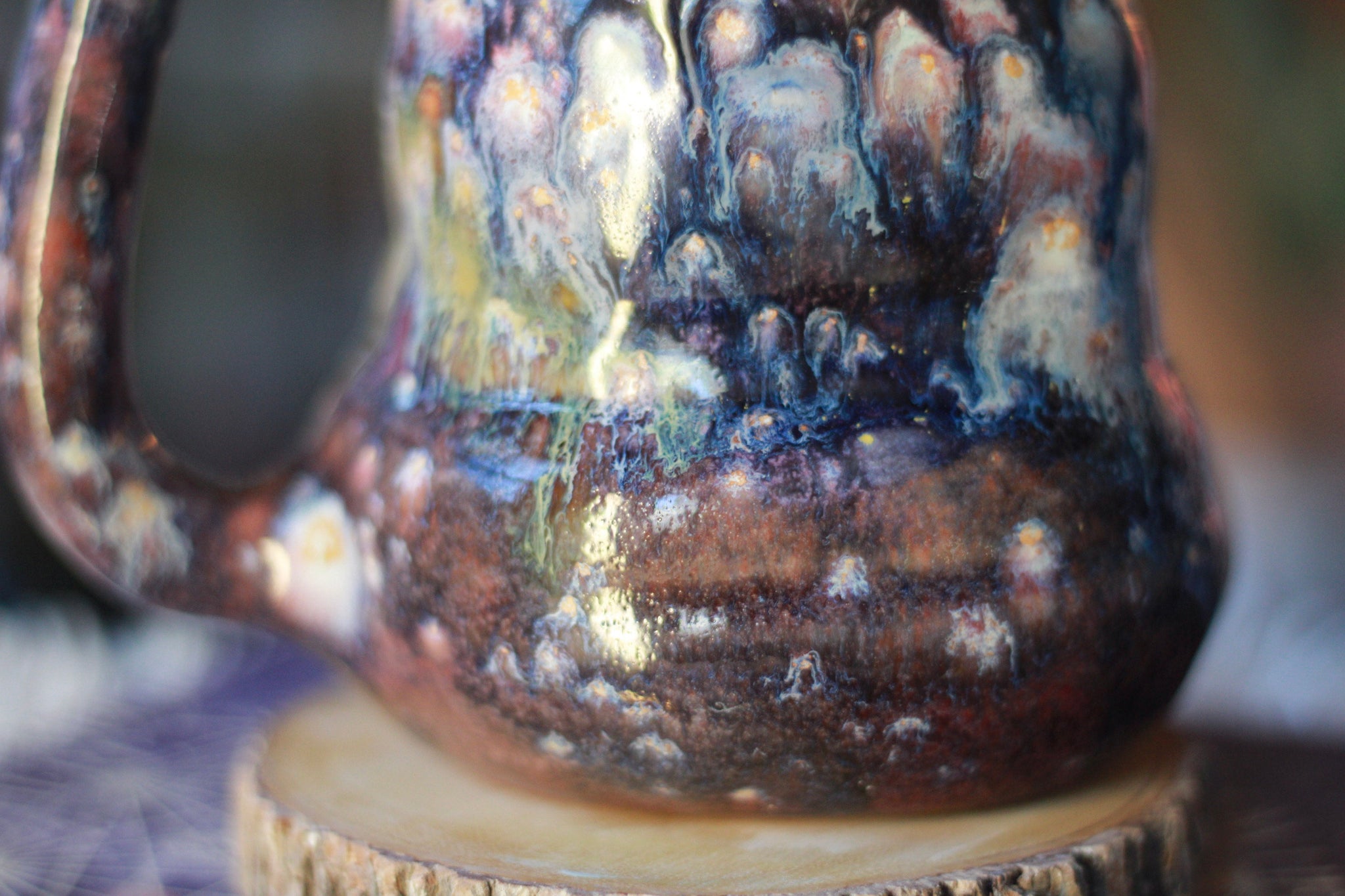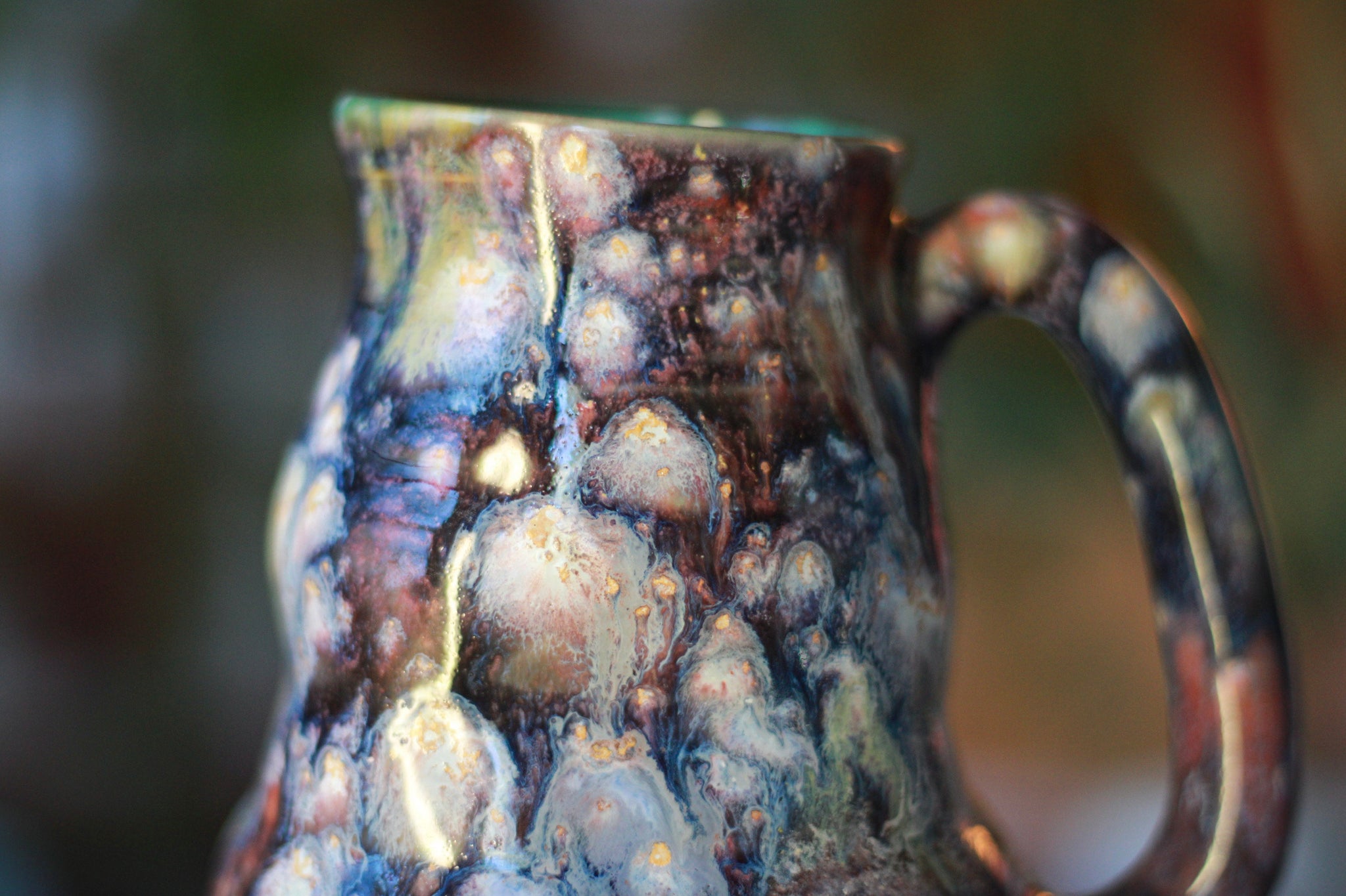 This ‘starburst-y’ Cuddle mug is a sensory delight to hold with its delicious heft, comfortably balanced four finger handle, soothing divots, subtle grooves and wide cuppable base. Sensory Details: This is not a smooth mug. The glaze bursts offer lots of engaging textural variety. For those who like engaging (yet consistent) textural variety, THIS is a deliciously engaging - and incredibly cozy - mug