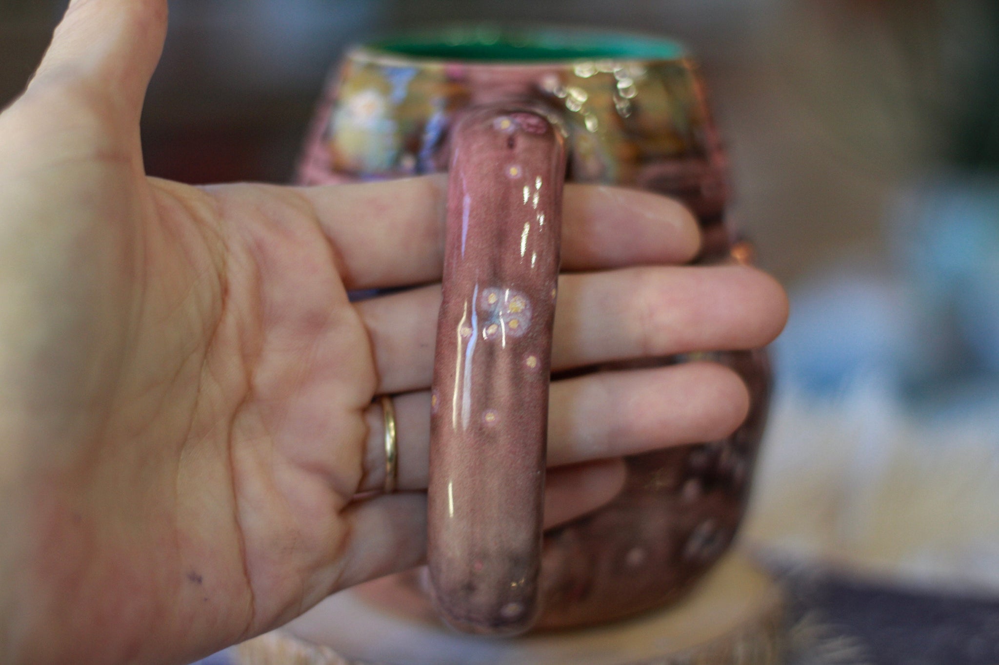 THE FEEL: This swirly mug has a playful vibe with a comfortable balanced four finger handle, hard to find perfect fit and a delicious cuppable handle