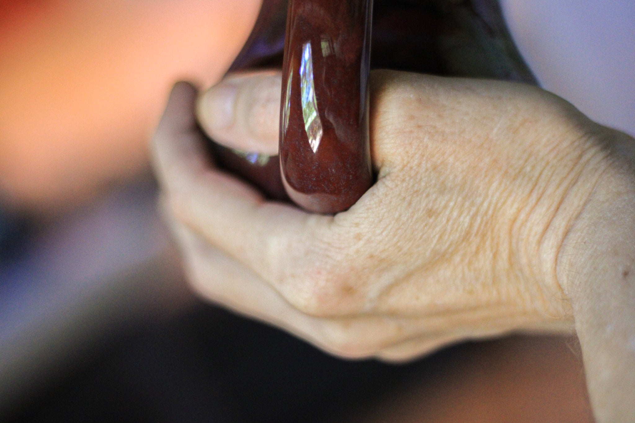 THE FEEL: This form has a bit of visual 'wonk' but is quite comfortable to hold with it's grounding weight, comfortable 4 finger handle, and wide cuppable base. Sensory Details: Hubby Jason's comfort pick.