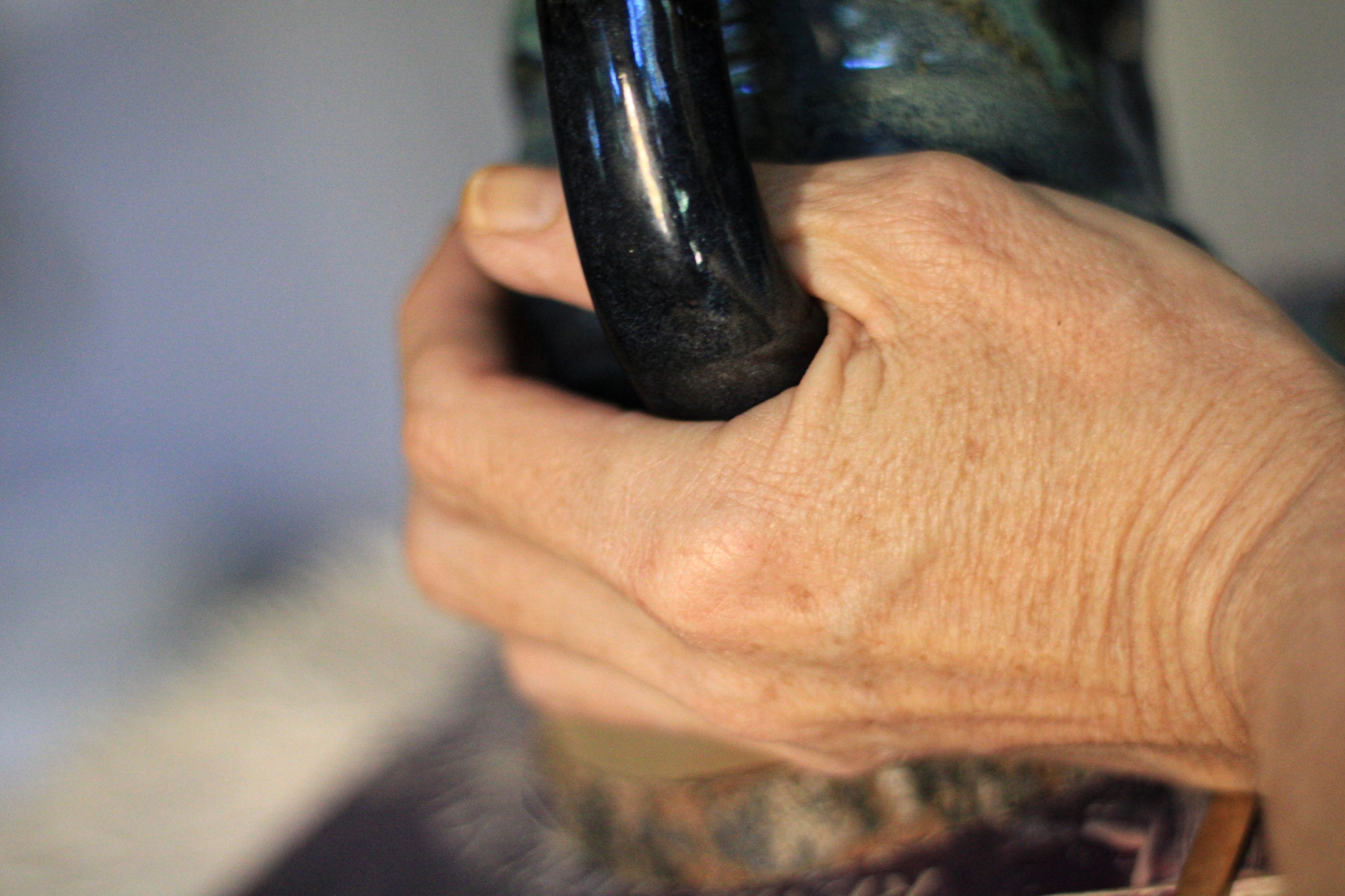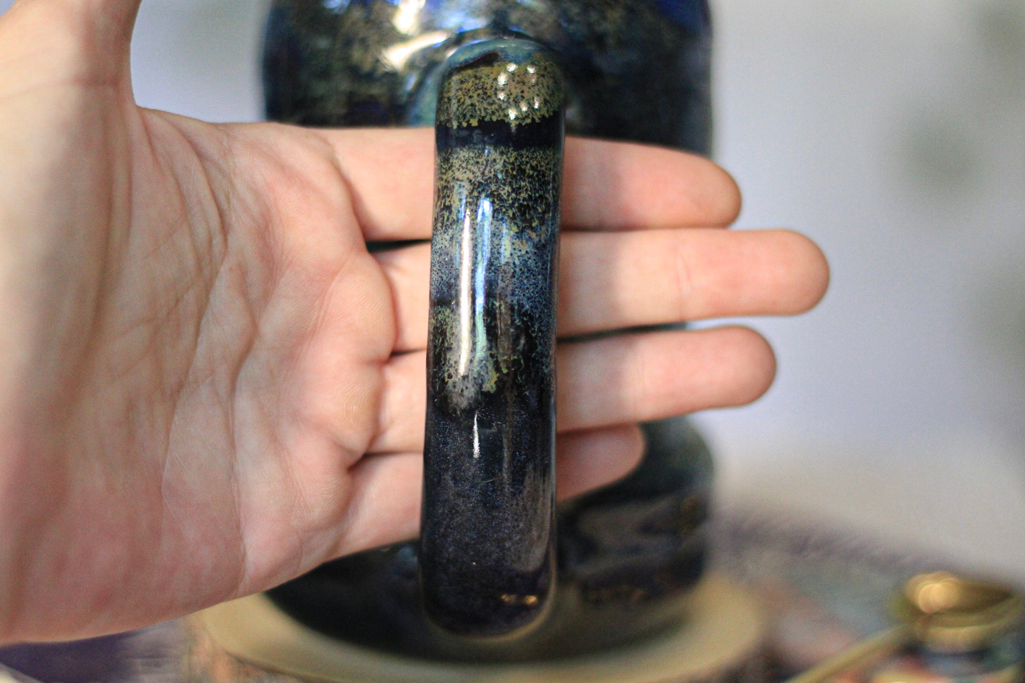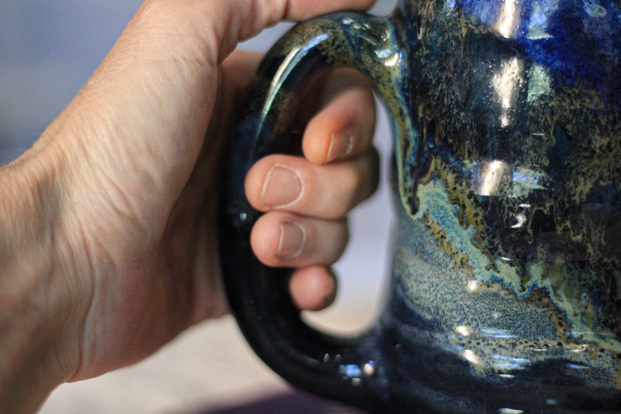 THE FEEL: This 'wabi-sabi' mug is 'chonky' and engaging with it's big huggable 4 finger handle, engaging grooves and a smooth wide base. Sensory details: this is not a calming mug...it's a "LET"S GET CREATIVE" feeling mug