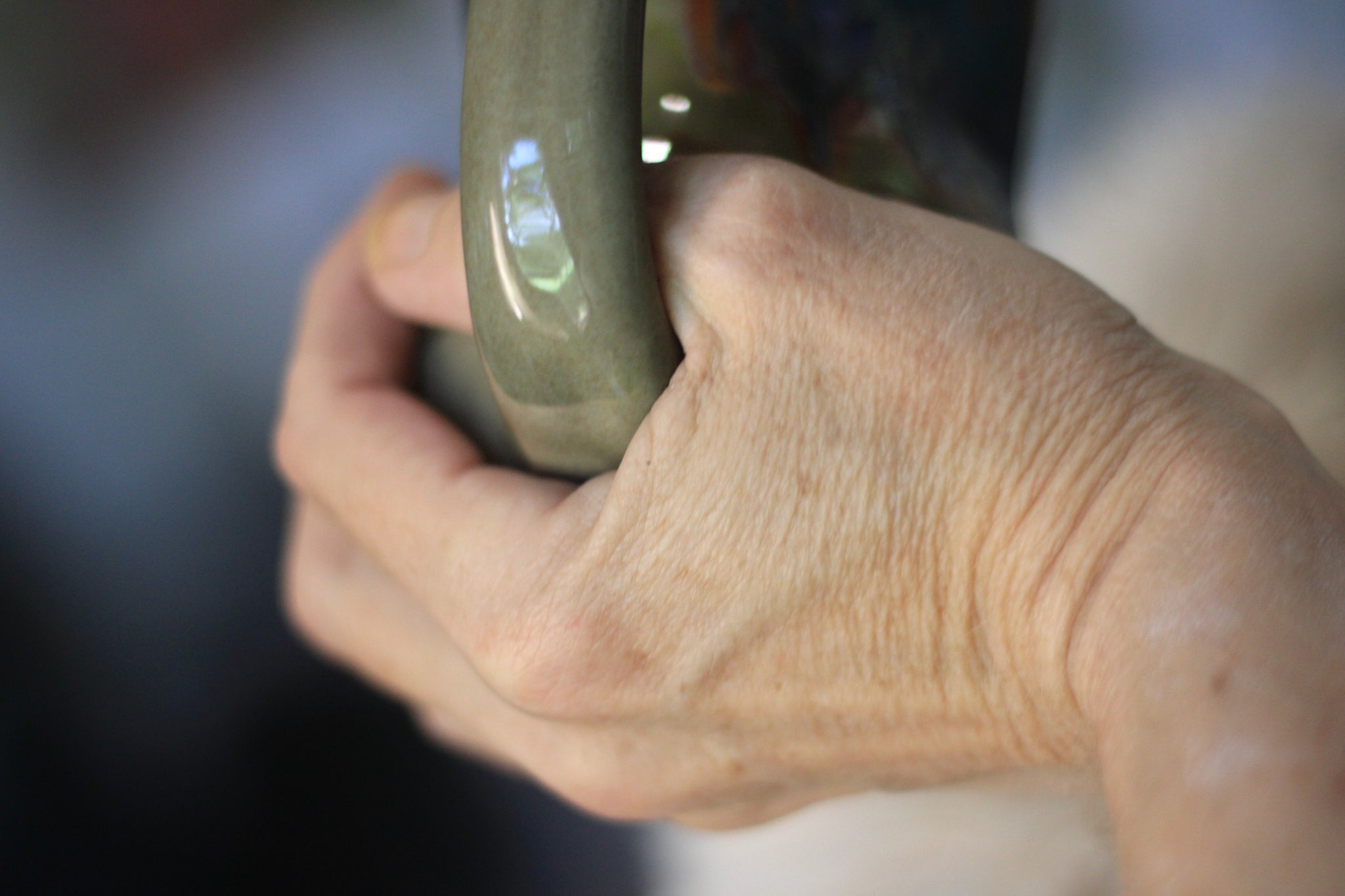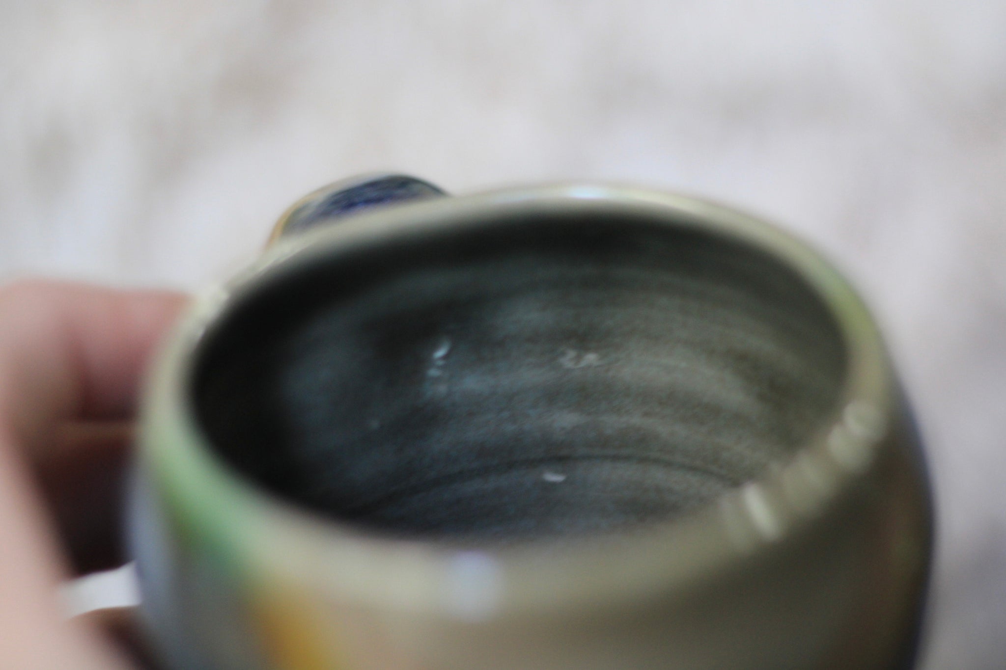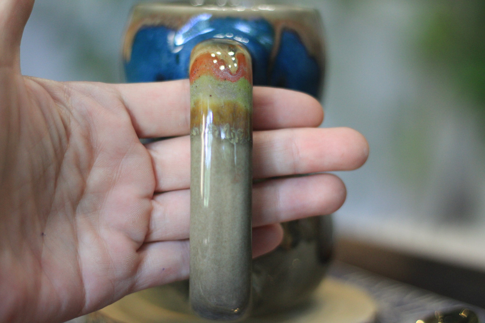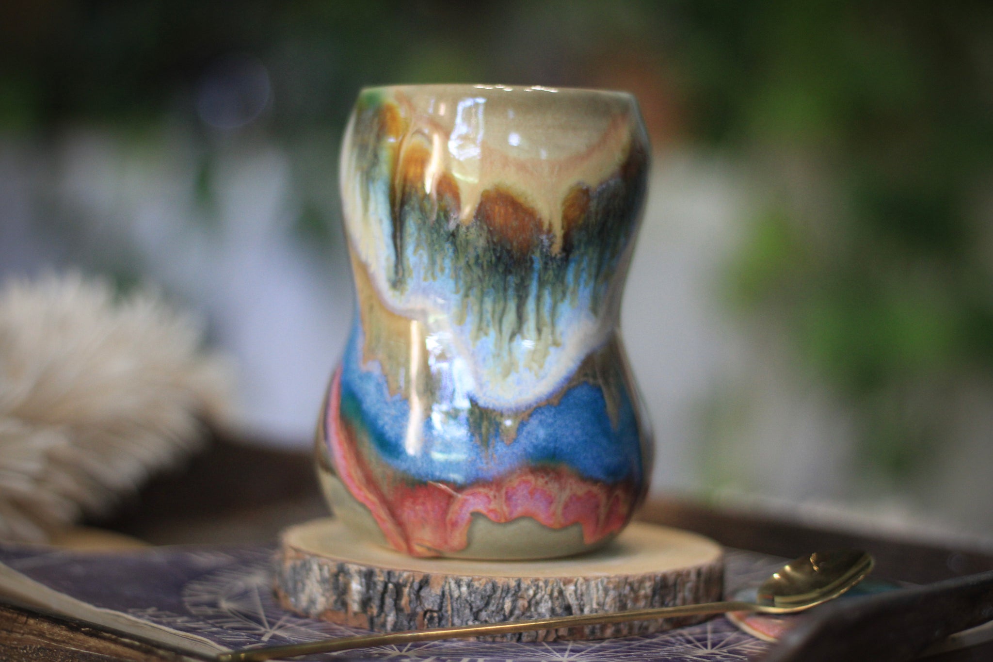 THE FEEL: This small curvy gourd mug is comfy to hold with its curvy waist and grounding heft, a comfortably balanced 4 finger handle, and a curvy cuppable  base.  Sensory details:  a perfect mug for a quick grounding break