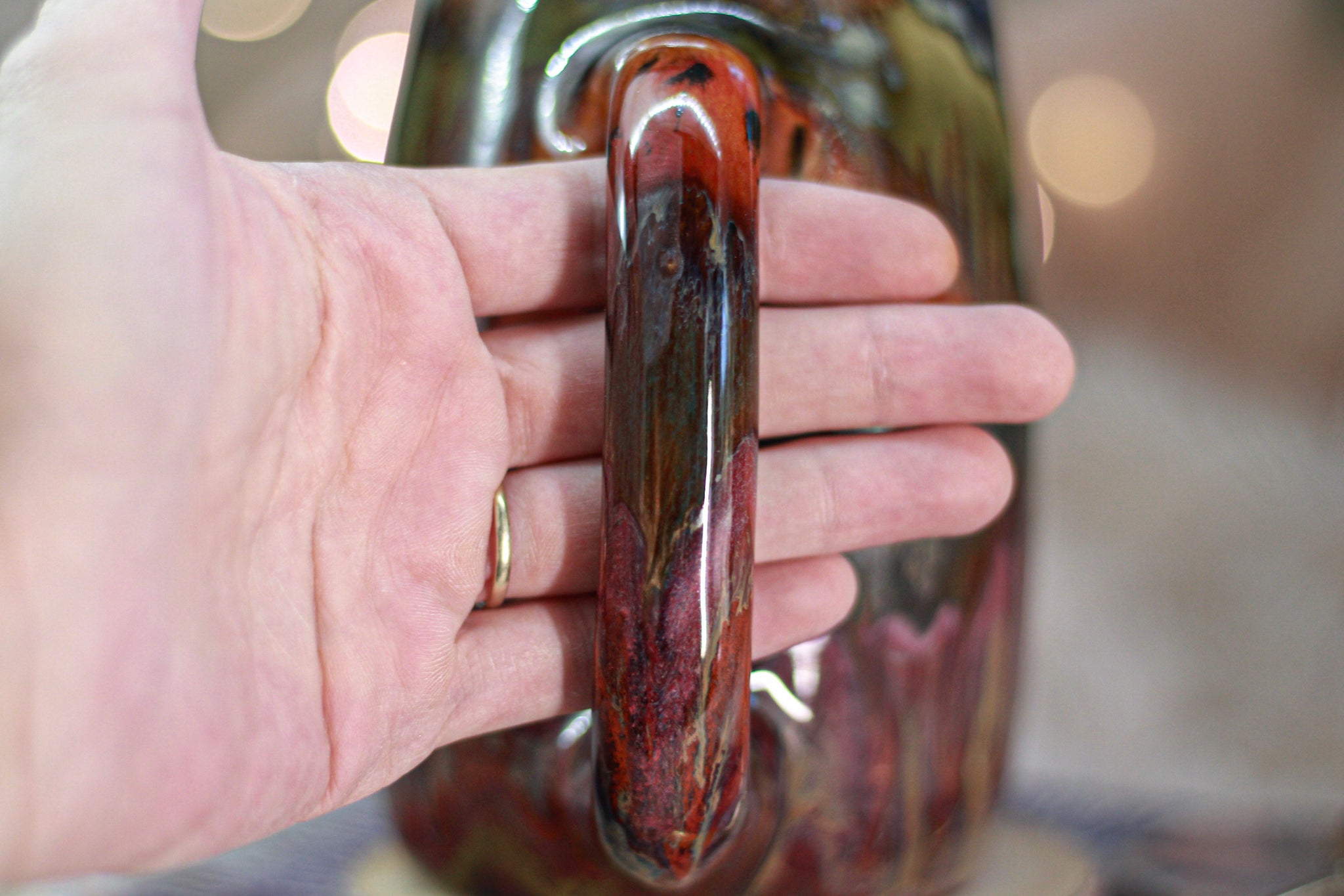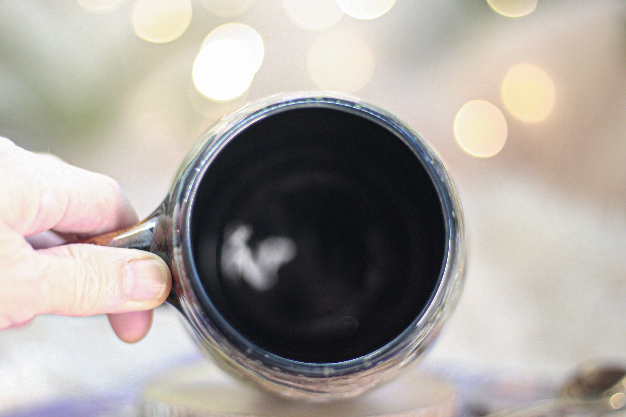It has a gentle dip in the rim that "kisses" the corners of your lips as you take a sip. The round shape, smooth base and ergonomic handle on each mug make it comfortable to hold in a variety of ways, with a size that allows you to stay cozy for a while and a thickness that offers some comforting weight and keeps your brew warm a bit longer.