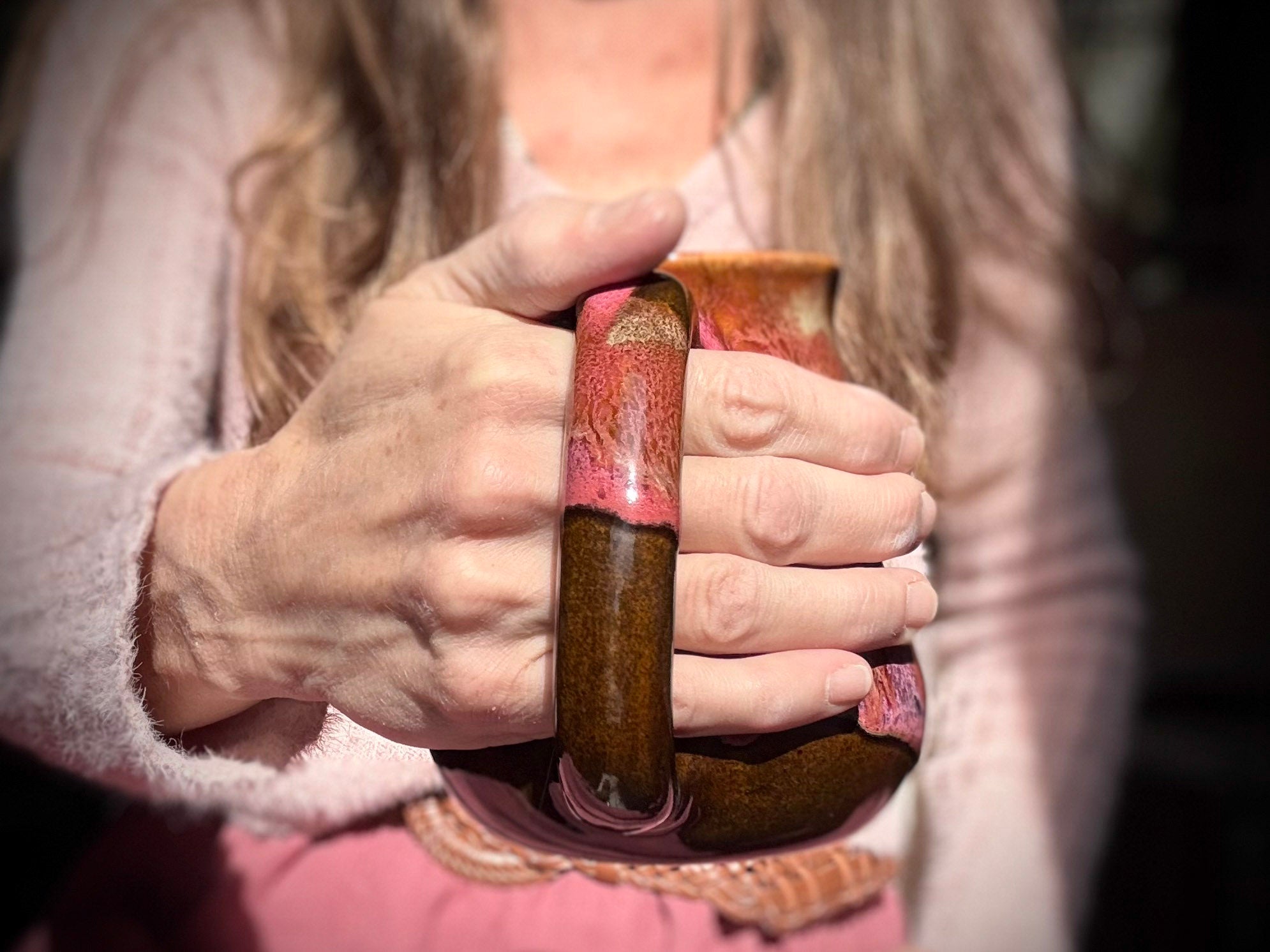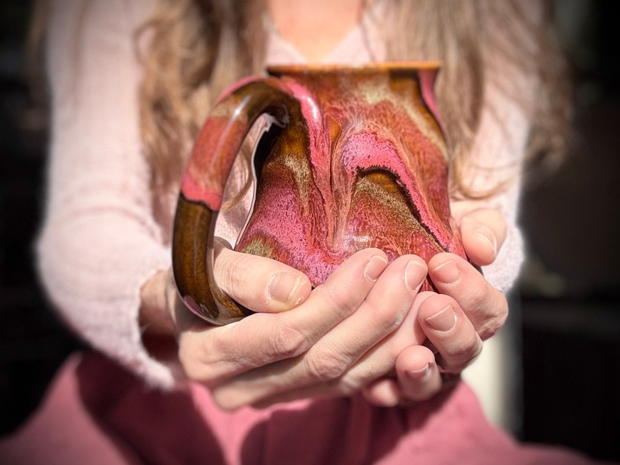THE FEEL: This curvy mug feels so cozy with its not too hefty weight, comforting 4 finger handle, gentle curves, lip hugging rim and its wide, cuppable base.