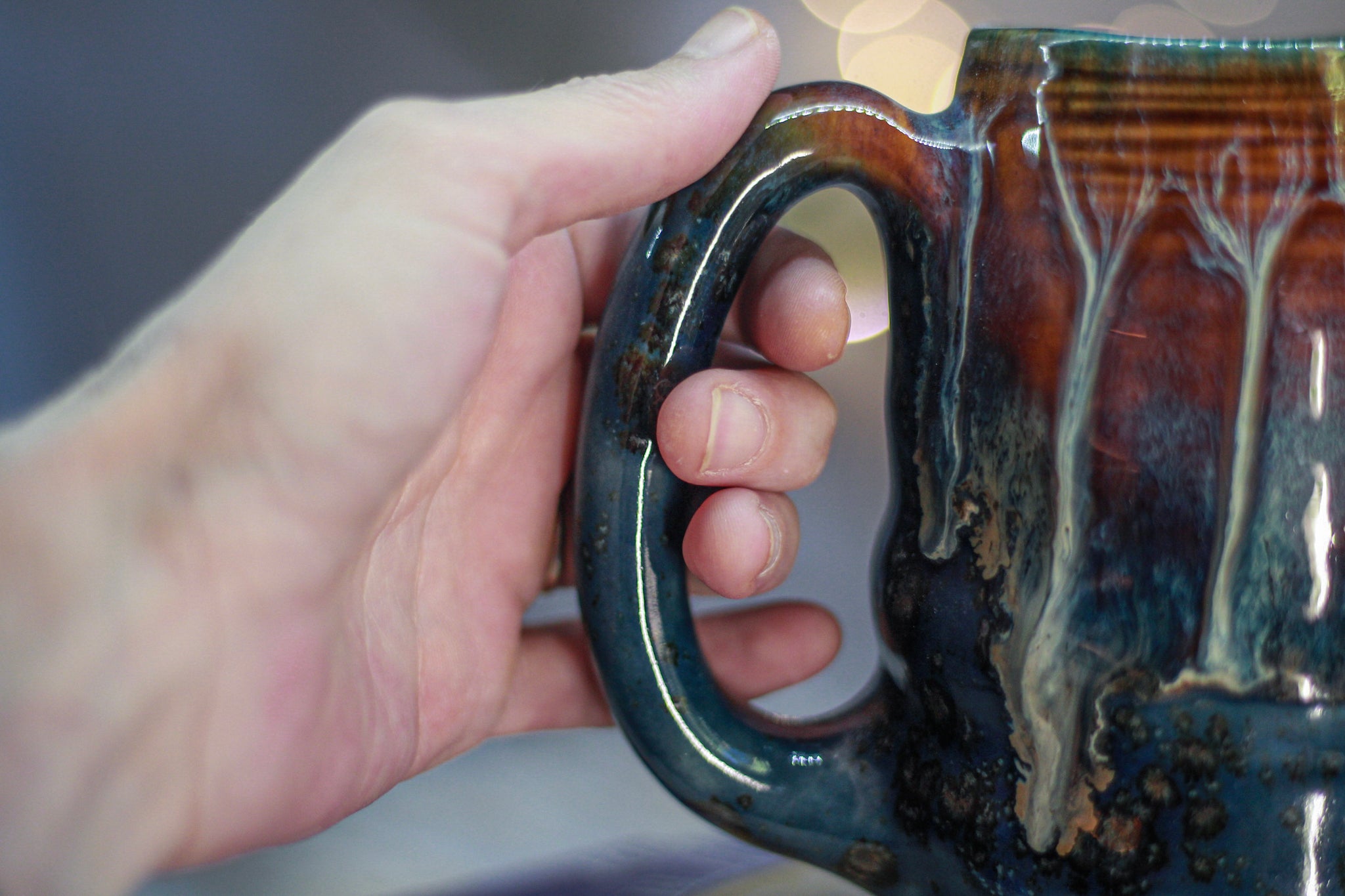 I LOVE the hint of turquoise peeking over the rim of this New Wave mug! The deliciously smooth base, the huggable handle and the gentle texture grooves that the fingers fall into make this cup incredibly cozy to hold and invites you to feel all the different ways your hands can engage with the shape.