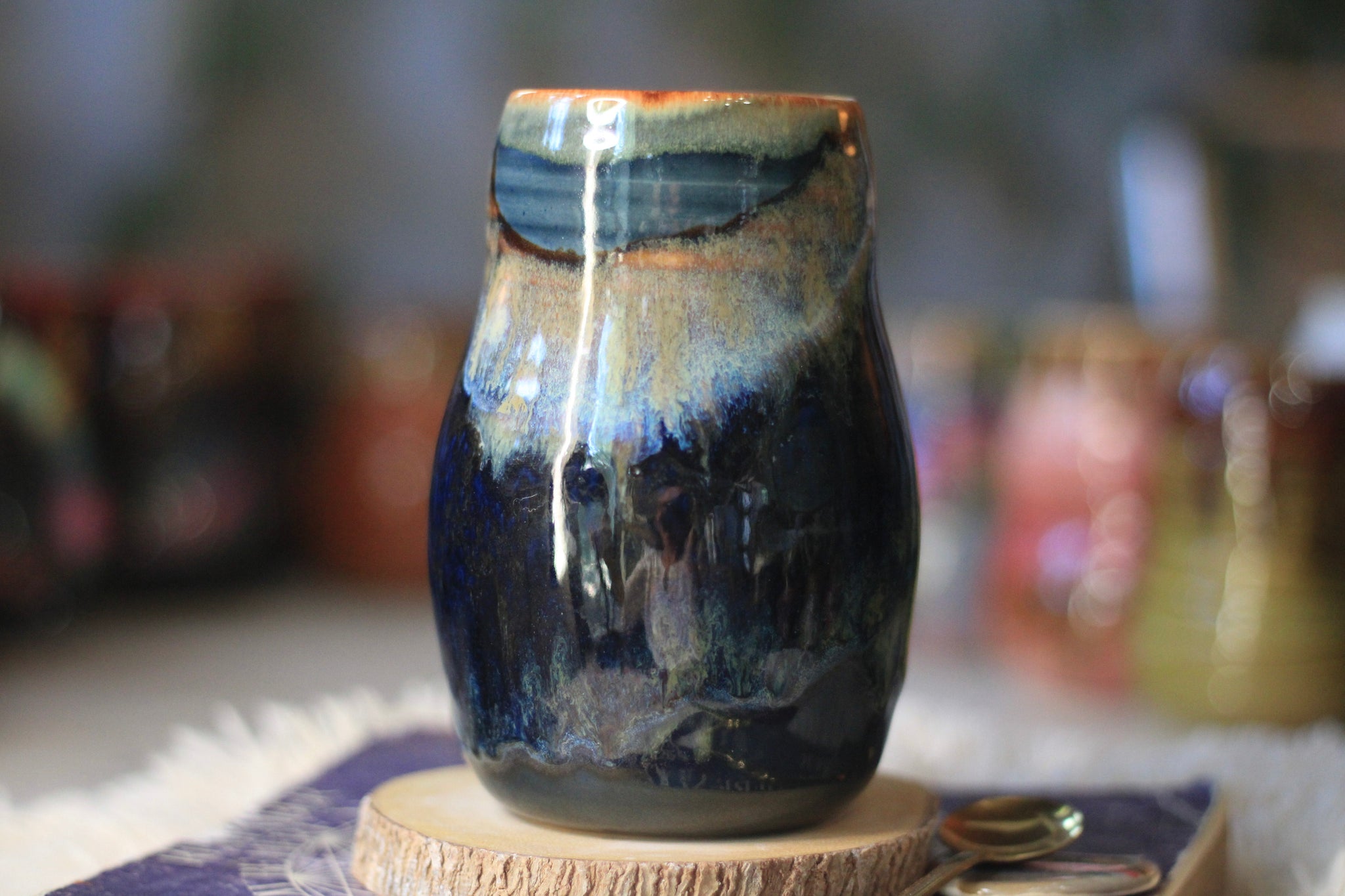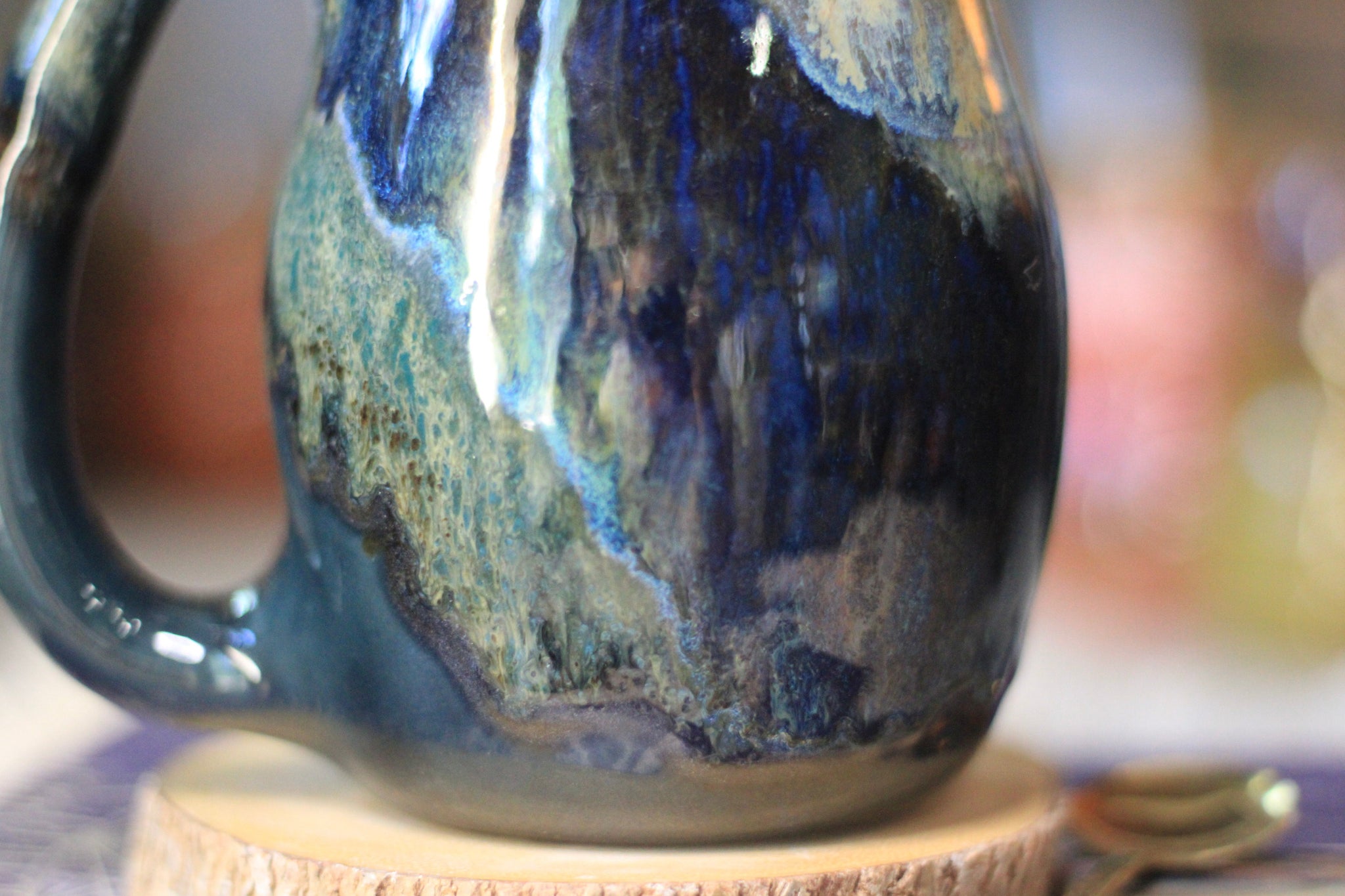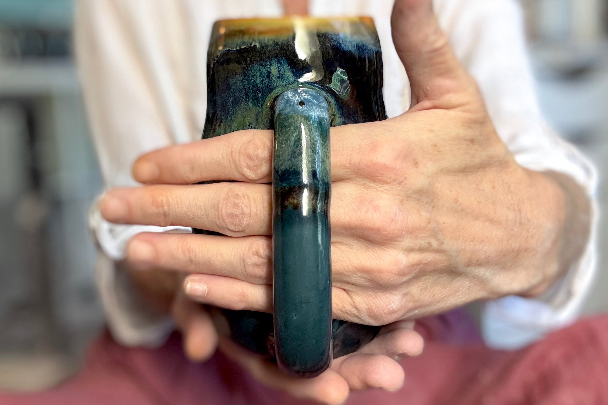 THE FEEL: This new, gently curved mug feels soothing to hold with its beautifully balanced 4 finger handle and a smooth, gently curved base. Its vibe is ‘calm, simple, soothing’. Sensory details: a few glaze bumps
