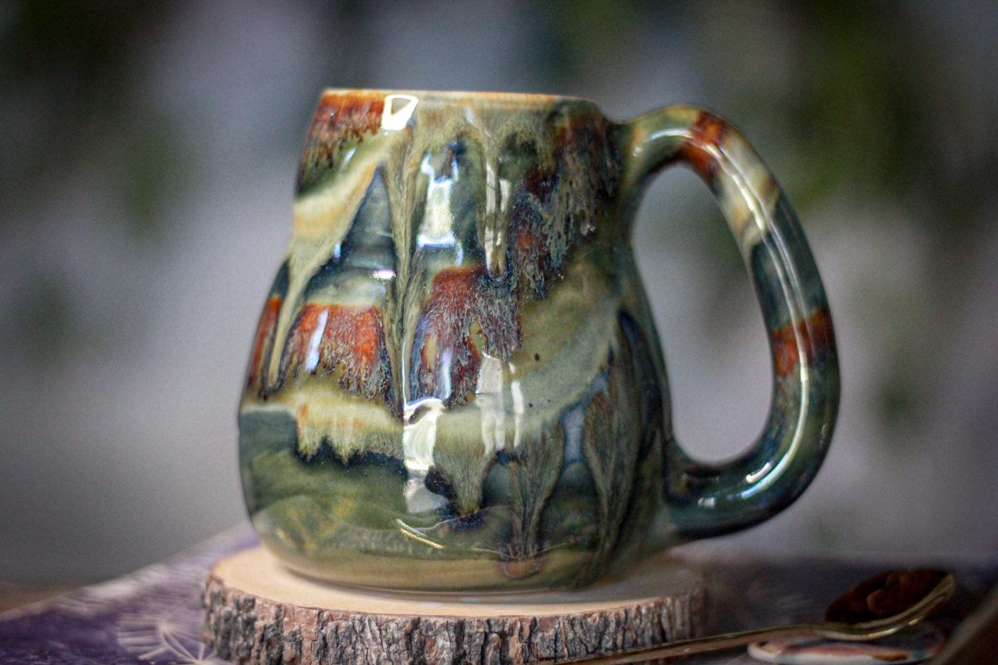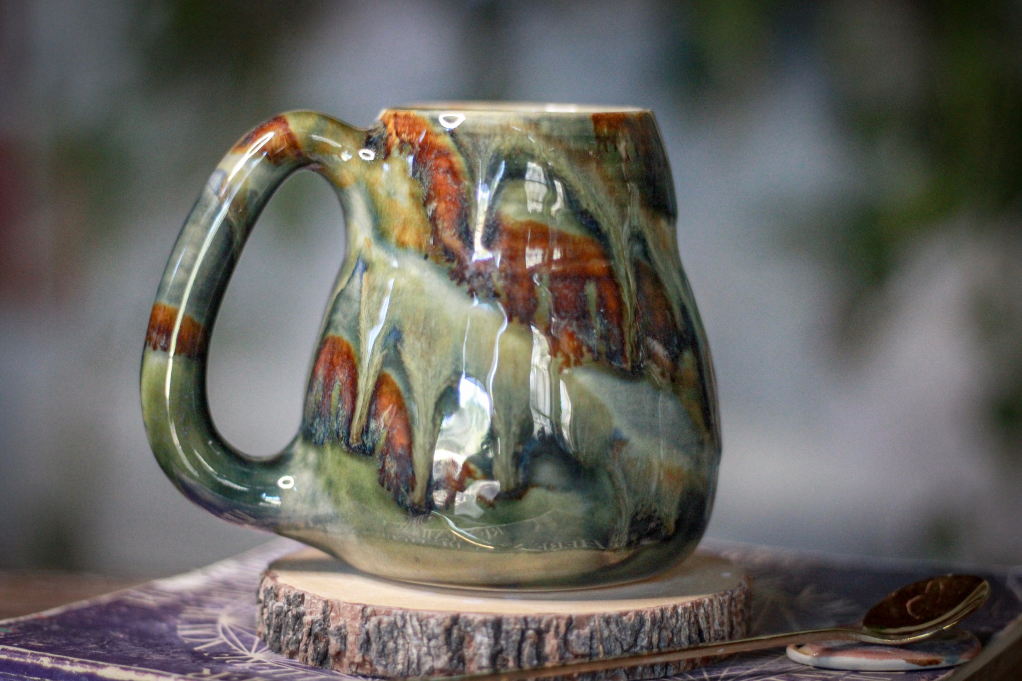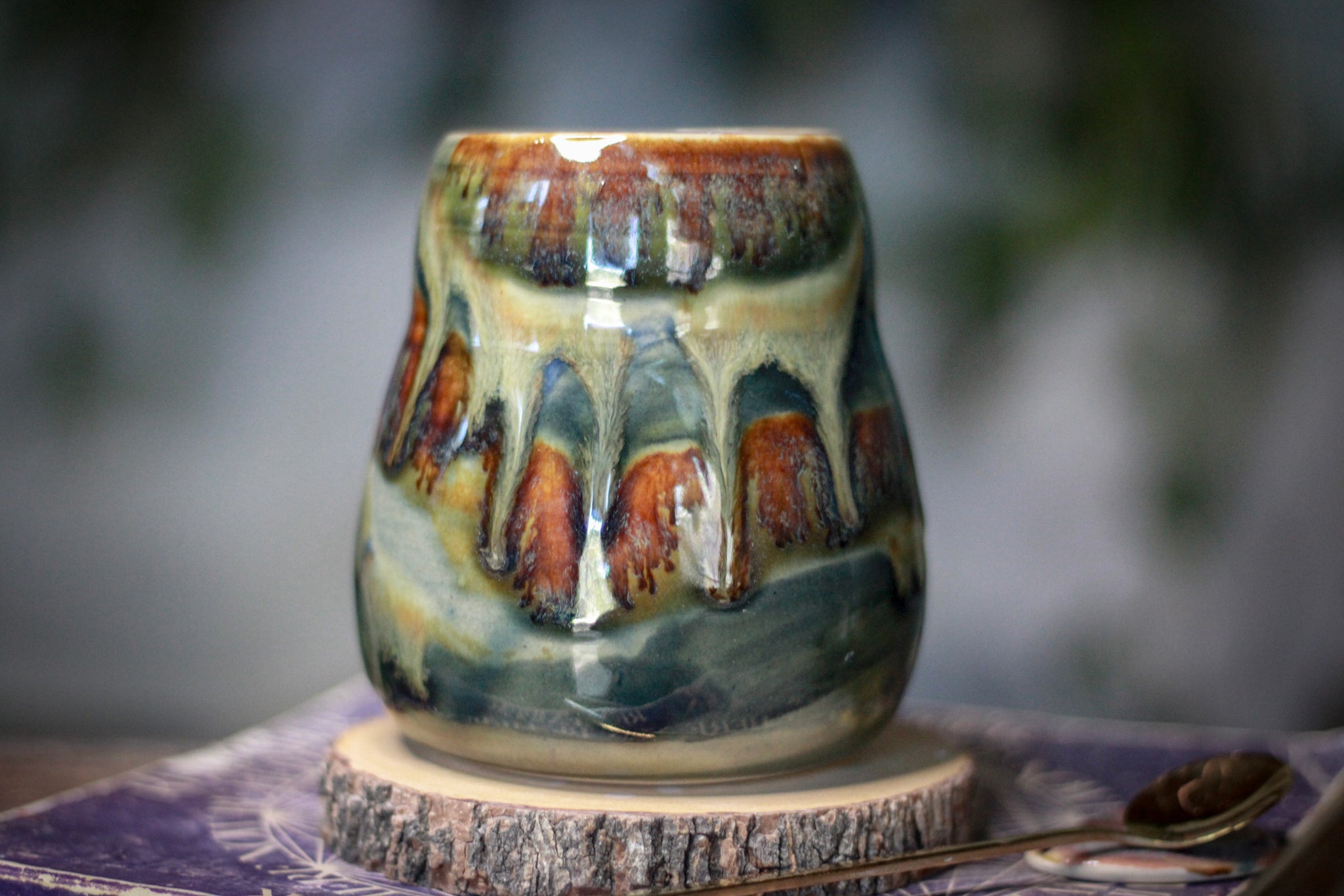 THE FEEL: This simple earthy gourd mug has a lovely grounding feel. It has a nice heft with a comfortable four finger handle and a cozy cuppable base.. The rim is rather oval, but in just the right way to give your nose a bit more room during a sip.