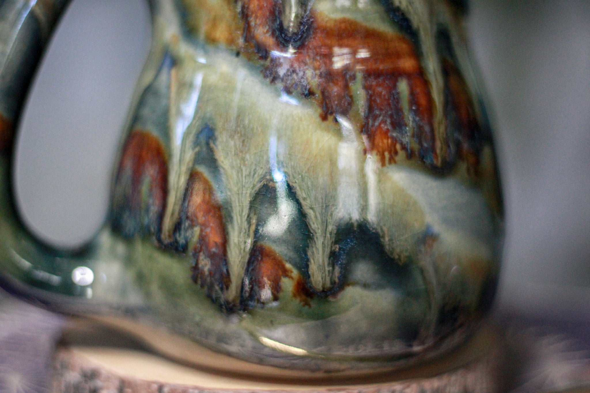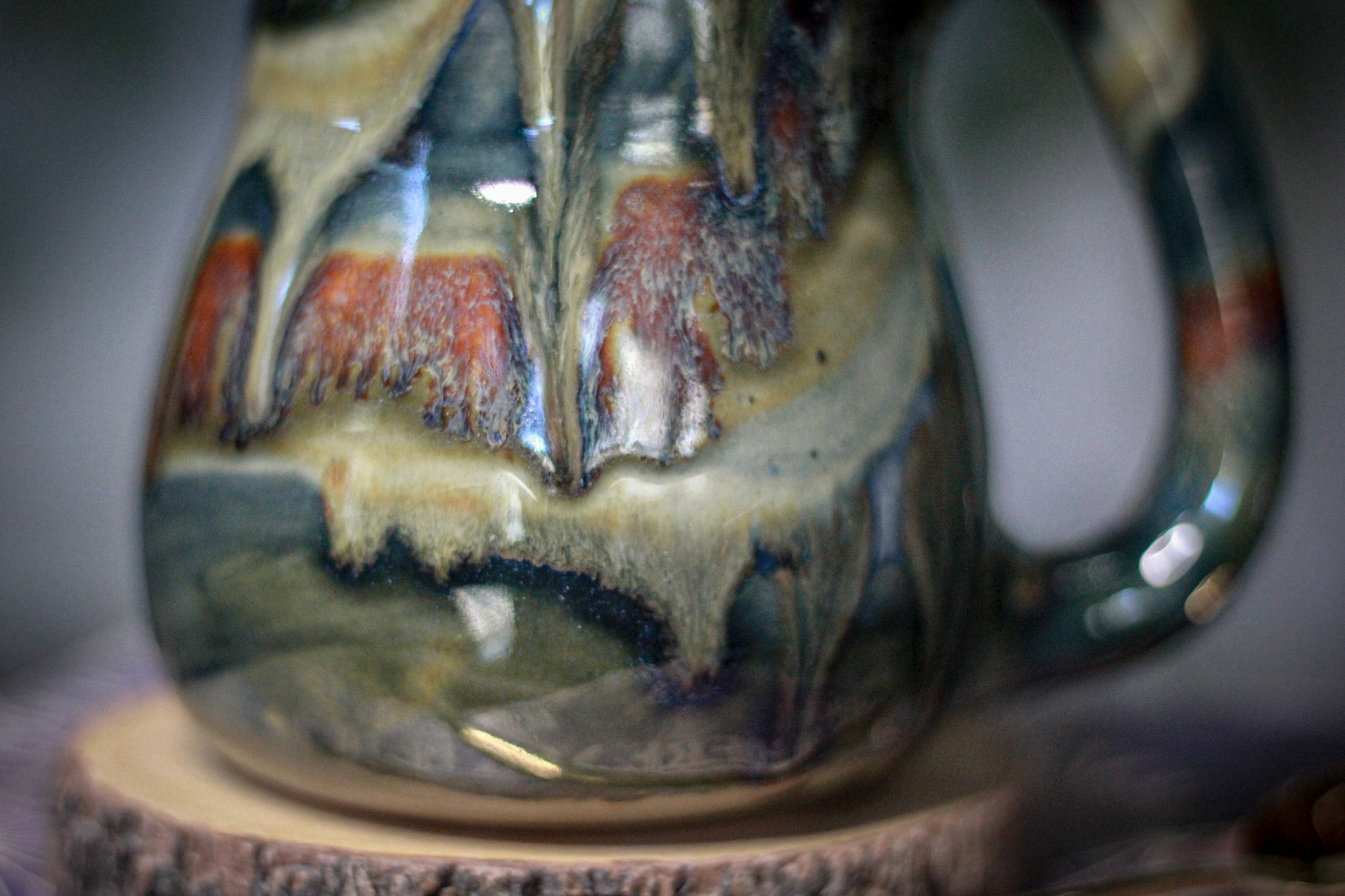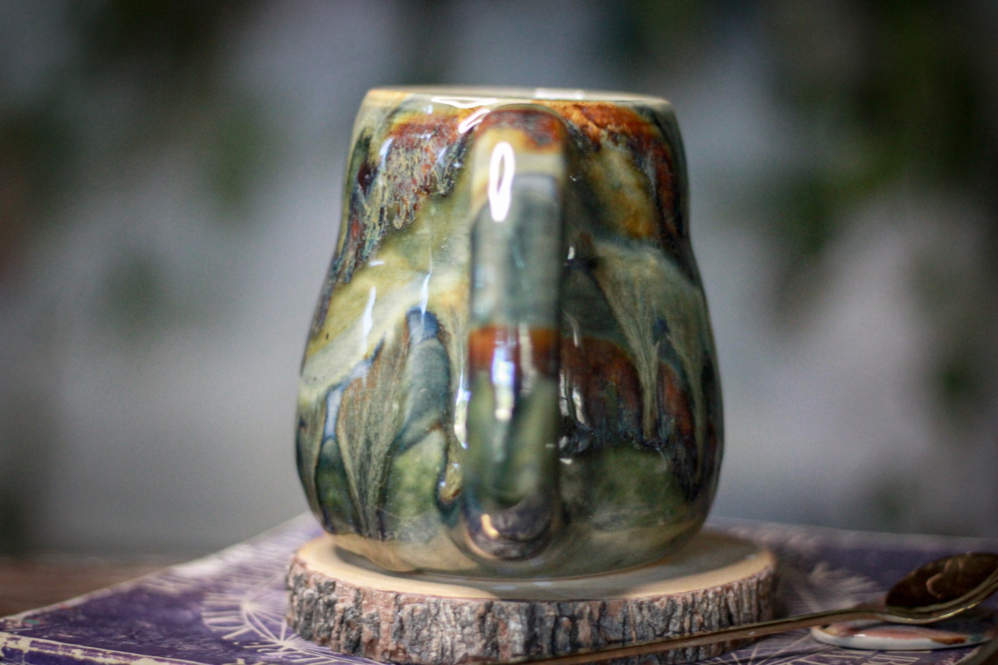 THE FEEL: This simple earthy gourd mug has a lovely grounding feel. It has a nice heft with a comfortable four finger handle and a cozy cuppable base.. The rim is rather oval, but in just the right way to give your nose a bit more room during a sip.